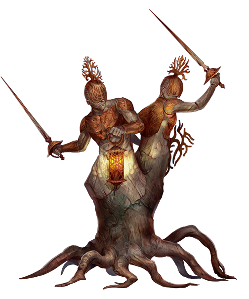 Twins of rowan are among the most powerful elementals on the Plane of Wood, specially crafted to patrol a wide range of wilderness and maintain the plane's carefully constructed order. Despite having two heads and torsos, each twins of rowan is a singular creature; like all wood elementals, their true consciousness is not in their heads but in the roots, and their true body is the trunk of the tree, not the extended limbs.
