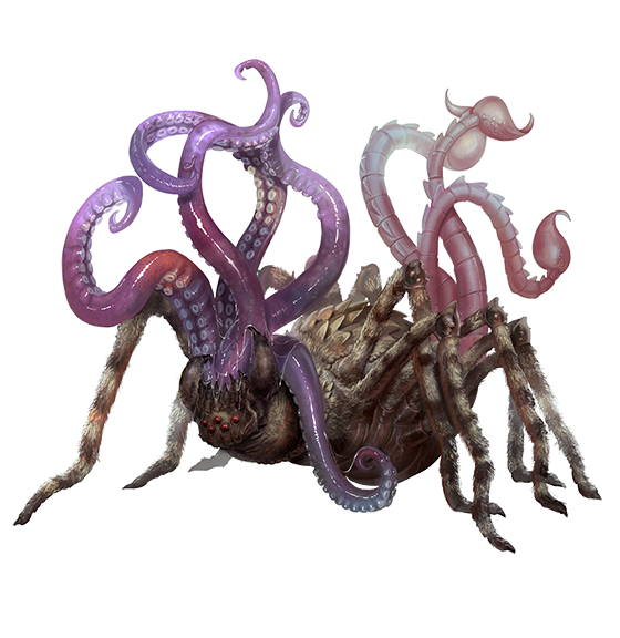 Although they spend most of their time hunting and battling demons for control of the Abyss, thulgants amuse themselves with a variety of diversions, such as maintaining galleries of petrified mortals or building massive, hive-like lairs filled with enslaved minions. Each of these qlippoth is a horrific tangle of limbs, with spiderlike legs, writhing tentacles emerging from the top of its head, and three scorpion-like stingers.