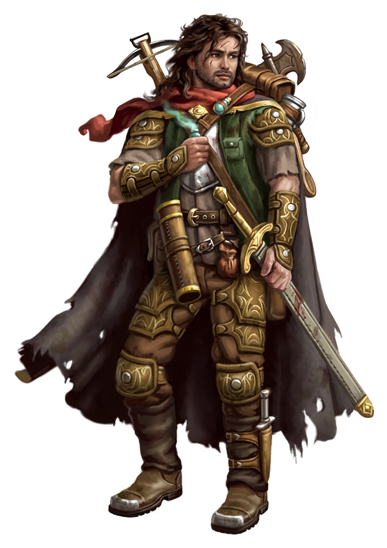 Melee [one-action] longsword +26 [+21/+16] (disarm, versatile P), Damage 2d8+11 slashingMelee [one-action] hatchet +25 [+21/+17] (agile, sweep), Damage 1d6+11 slashingRanged [one-action] crossbow+23 [+18/+13] (range 120 feet, reload 1), Damage 1d8+6 piercingDefensive Slice [one-action] Requirement Baron Drelev hasn't attempted a Strike during this turn. Effect Baron Drelev assumes a defensive position with his weapons out, then attempts a melee Strike. He takes a –2 status penalty on all Strikes (including this one) and gains a +2 status bonus to his AC until the start of his next turn.Dramatic Disarm If Baron Drelev scores a critical success on an Athletics check to Disarm an opponent, he can choose to have the disarmed item fly 1d4 × 5 feet in a random direction rather than have it fall to the ground in the opponent's space. If this causes the item to land in a space occupied by a creature with at least one free hand, that creature can attempt a DC 20 Reflex save to catch the item (otherwise it falls to the ground in that space).Harrying Swordfighter Baron Drelev adds the disarm weapon trait to any sword he wields.Skirmish Strike [one-action] Frequency once per turn; Effect Baron Drelev Steps and then Strikes or Strikes and then Steps.Sneak Attack Baron Drelev deals 2d6 extra precision damage to flat-footed creatures.